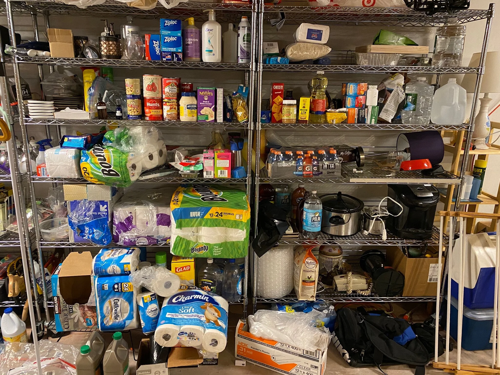 Basement shelves filled with survival ephemera left by the previous owner aka “the bodega”.
