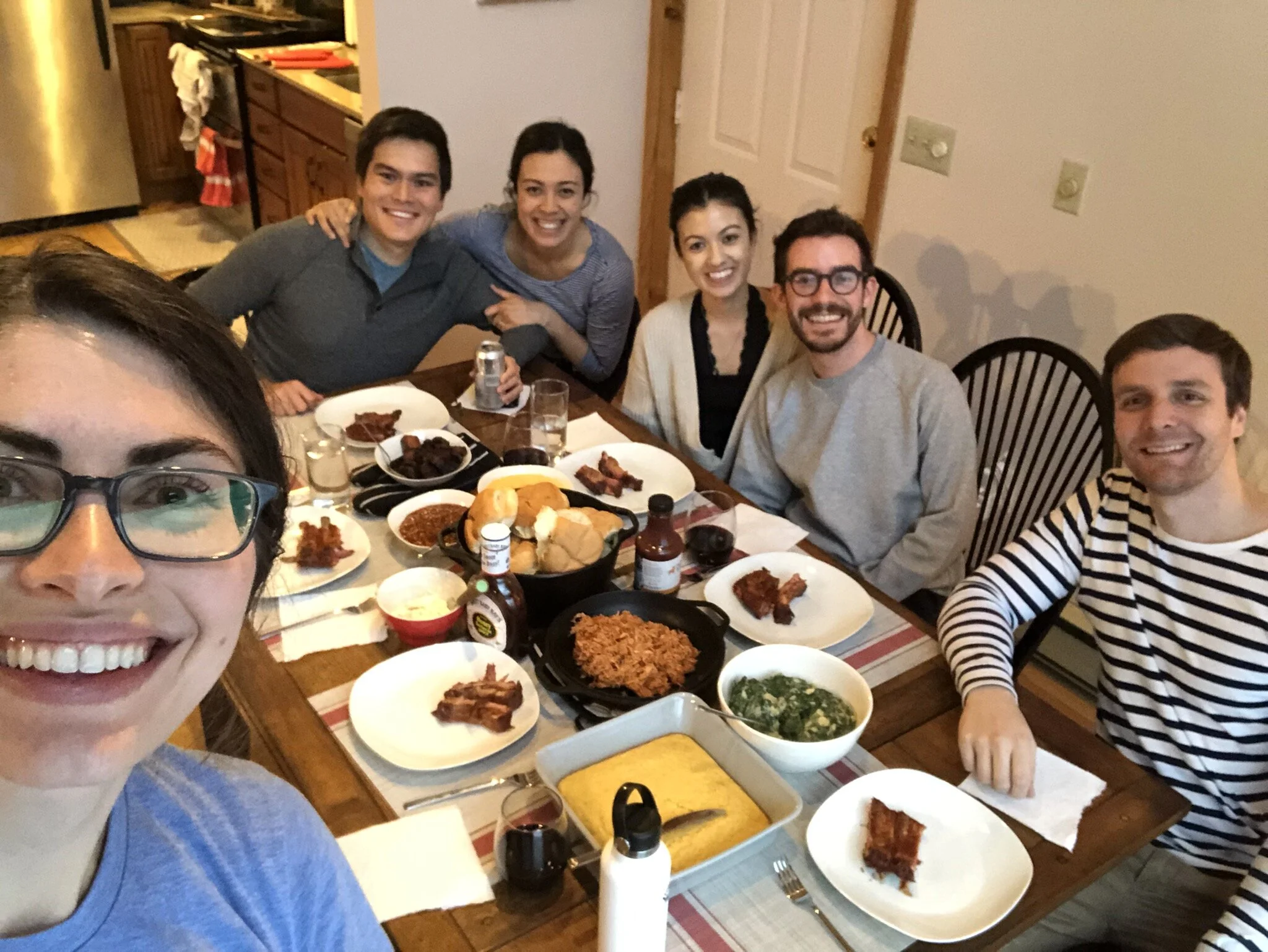 Barbecue feast (Jack Stack) sent by Anne’s dad! Burnt ends, pork, chicken, cornbread, creamed spinach, and chocolate cake.